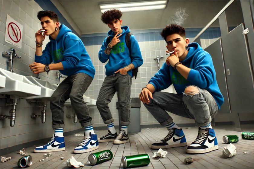 Ellos se encontraban ahí en el baño son del cuarto año y dado que su profesora de literatura faltó por asuntos personales, este grupo de ” “Niños ricos, bien “ ya que les quedaba la primera hora de la jornada de clases libre aprovecharon el momento para ir a fumar al baño, ya que es el único lugar en donde no hay nadie vigilando y al ver a Teo no dudaron en increparlo, y el primero de ellos fue el Rino Oski quién en tono burlón dice: